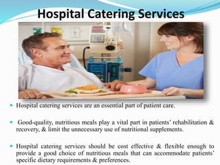 The document discusses hospital catering services. It provides details on core objectives and services of a catering department including menu planning, material management, costing, and food safety. It outlines the roles and responsibilities of catering staff. The document also discusses challenges around staffing and proposes remedial measures. Key performance indicators for evaluating catering services are presented. The conclusion emphasizes the importance of identifying patient nutritional needs, effective communication, and continual quality improvement.
