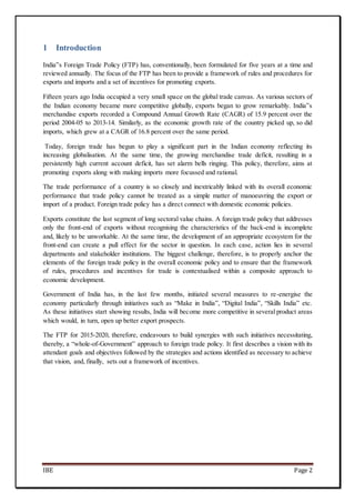 The document summarizes key aspects of India's new Foreign Trade Policy for 2015-2020, which was announced on April 1, 2015. Some of the main points include: