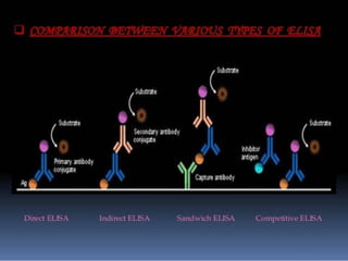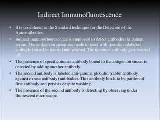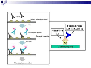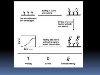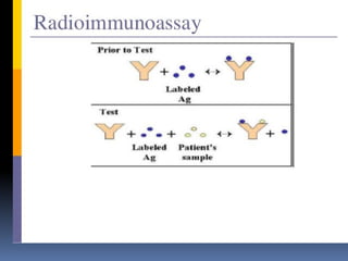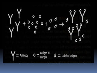 Immunoassays are tests that utilize the specific immune response between antibodies and antigens to determine the concentration of these molecules in a solution. They employ labeled materials and various separation techniques to measure analyte presence and can be classified into competitive and non-competitive types. Advantages include high sensitivity and specificity for detecting specific compounds, while disadvantages include limitations in certain compounds' detection and potential negative results not ruling out substance presence.