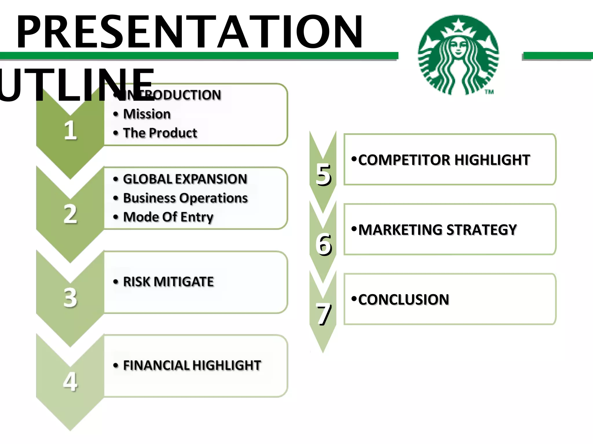 This document appears to be a presentation about Starbucks given to an associate professor. It includes sections on Starbucks' history and founding in 1971, its mission statement, global expansion strategies including different models used, key competitors like The Coffee Bean & Tea Leaf, and marketing strategies. It also includes financial highlights and analyses of Porter's Five Forces. The conclusion section is blank.