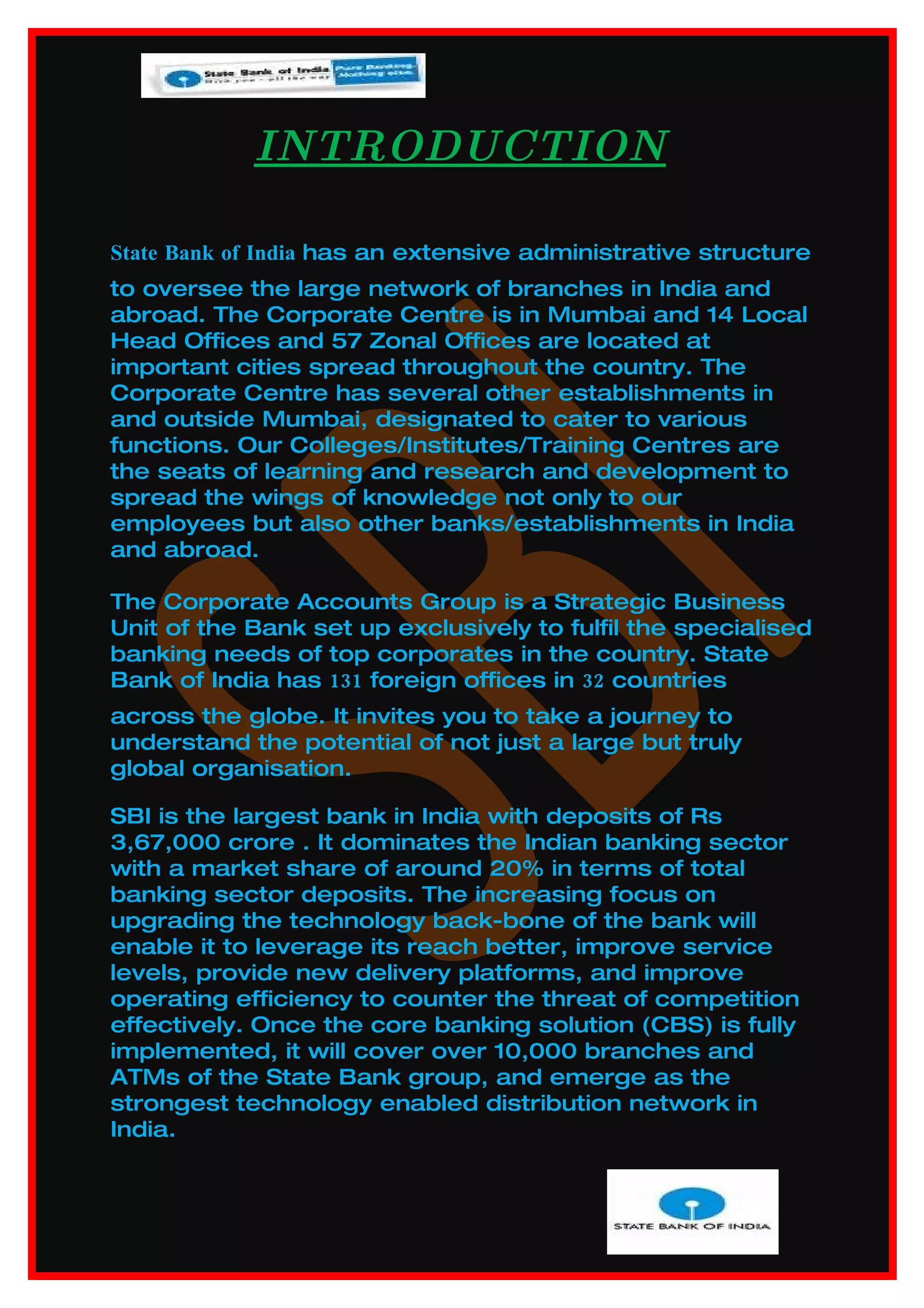 State Bank of India (SBI) is the largest bank in India with over 9,000 domestic branches and 51 international branches across 31 countries. SBI offers a wide range of banking and financial products and services to both retail and corporate customers through its extensive network. It is undergoing a transformation to modernize processes and technology to improve customer experience and compete effectively. SBI aims to expand its reach in rural India and provide innovative banking models to underserved areas.