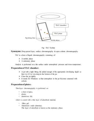 Thin layer chromatography (TLC) is a technique used to separate mixtures and identify compounds. It involves applying a sample to a thin layer of adsorbent material like silica gel coated on a plate. The plate is then placed in a developing chamber containing a mobile phase liquid. Each component in the sample travels differently through the stationary phase based on how strongly it interacts with the adsorbent material and mobile phase. The distance each compound travels allows it to be identified or quantified using its retention factor. TLC is a simple, fast, and inexpensive analytical technique used in research, purity testing, and separation of organic compounds.