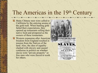 The document summarizes key events in the history of the Americas in the 19th century. It discusses how Chinese immigrants came to California during the Gold Rush and opened restaurants when prospecting failed. It also describes the expansion of the United States leading to tensions with Native Americans and conflicts over slavery. The document then briefly outlines political issues in Canada and Latin America during this period before shifting to discuss the impacts of the Little Ice Age.