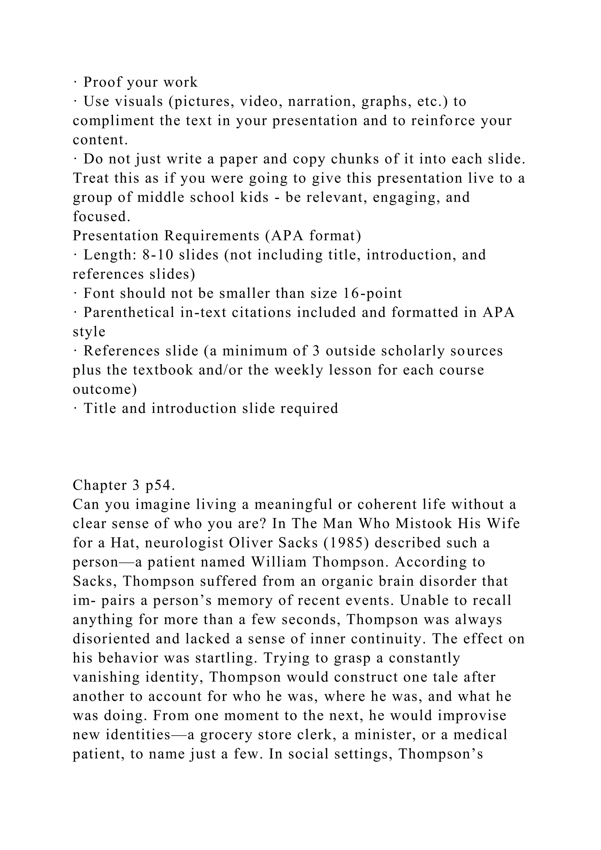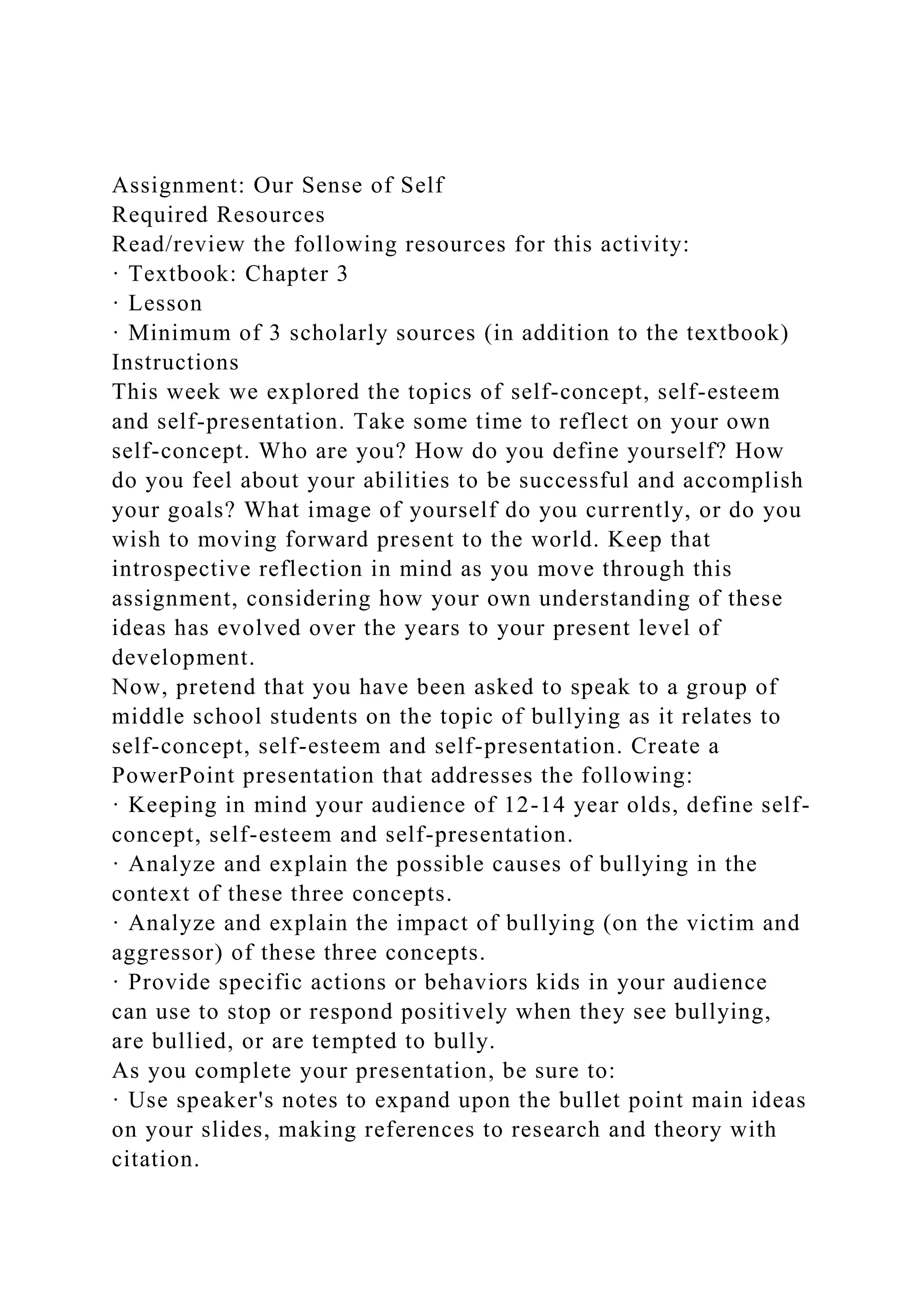 The document outlines an assignment focused on self-concept, self-esteem, and self-presentation in relation to bullying, requiring the creation of a PowerPoint presentation aimed at middle school students. It emphasizes defining key terms, analyzing causes and impacts of bullying, and offering actionable behaviors for the audience. Additionally, it highlights the significance of self-reflection and social interactions in shaping one's identity and provides insights from psychological research on self-perception.