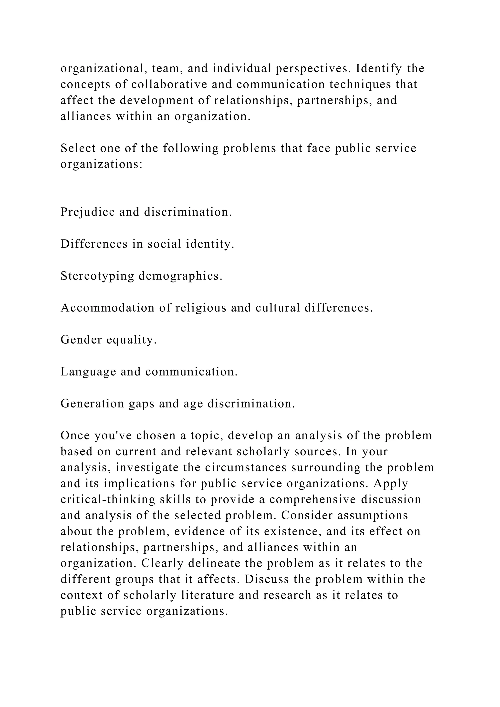 The document outlines an assignment requiring a word paper that analyzes a diversity-related problem within public service leadership as the first component of a course project. Students must select a specific problem, explore its implications, and discuss related concepts such as collaborative techniques and communication in the context of scholarly research. The assignment emphasizes the importance of using recent academic sources and maintaining a formal academic tone.