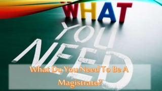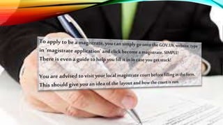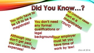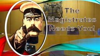The document discusses the demographics of magistrates in the UK legal system. It notes that over 50% of magistrates are female, but only 8% are from an ethnic minority. Very few magistrates are under 30 years old, representing just 0.37% , while over 57% are over 60 years old. It encourages more diversity in age and background for magistrates. It also mentions that a Magisterial Committee provides training for magistrates and court clerks to ensure proper supervision in the courts.