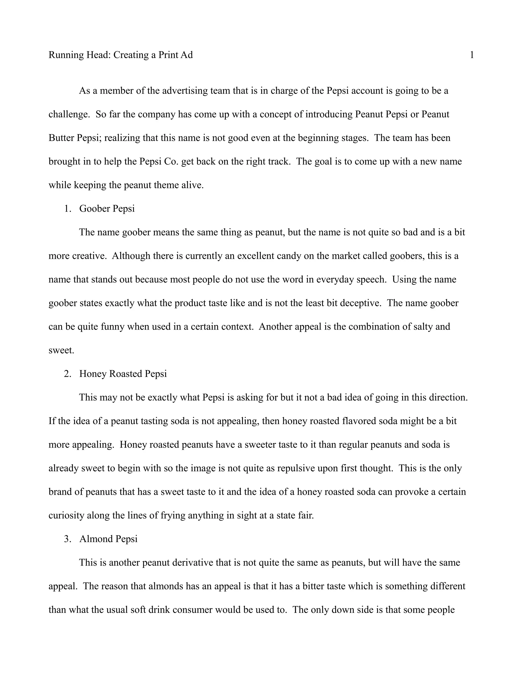 The advertising team for Pepsi is tasked with coming up with a new peanut-flavored soda after "Peanut Pepsi" was rejected. They propose "Goober Pepsi" to keep the peanut theme while having a more creative name. The print ad will feature a cartoon boy smiling as he sprints with a Goober Pepsi, with his peers looking on in disbelief. The ad targets Generation Y and lower Generation X to appeal to their youthful image and impulse buying habits.