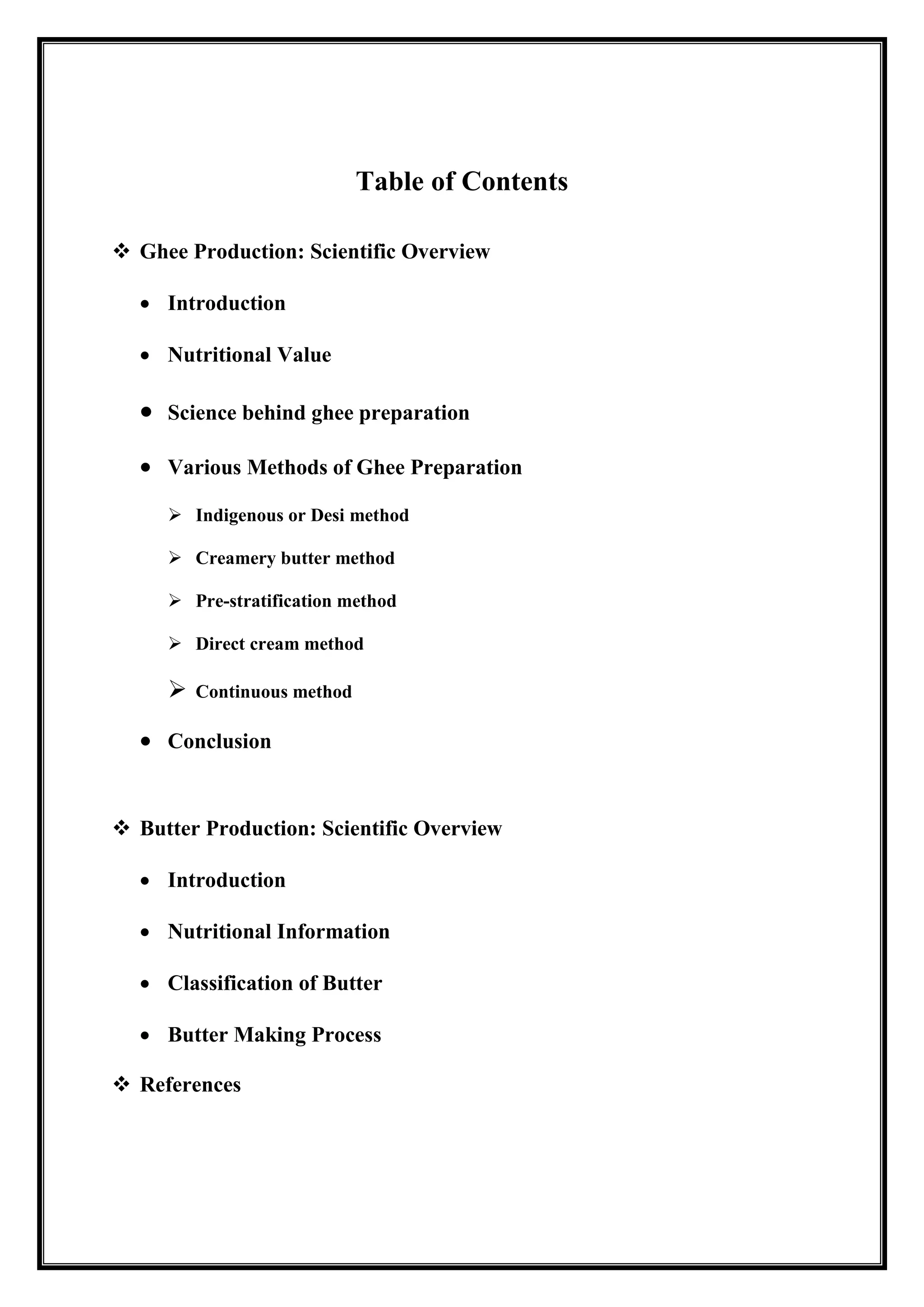The document provides a comprehensive overview of ghee and butter production, detailing various methods of preparation including indigenous, creamery butter, pre-stratification, direct cream, and continuous methods. It emphasizes the nutritional value and scientific principles behind ghee production, highlighting the importance of minimizing butterfat loss and maintaining quality. Additionally, it covers the butter-making process, including the classification and production of different types of butter.