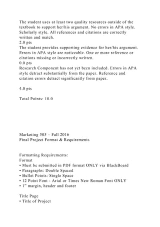 The document outlines an assignment rubric for a marketing course project, detailing criteria for evaluating content, writing quality, and research components. It provides comprehensive formatting and structure requirements for the project, including sections for executive summary, situation analysis, market analysis, and a personal mission statement. It emphasizes the importance of personal marketing plans for career success and the value of self-assessment in aligning personal goals with professional opportunities.