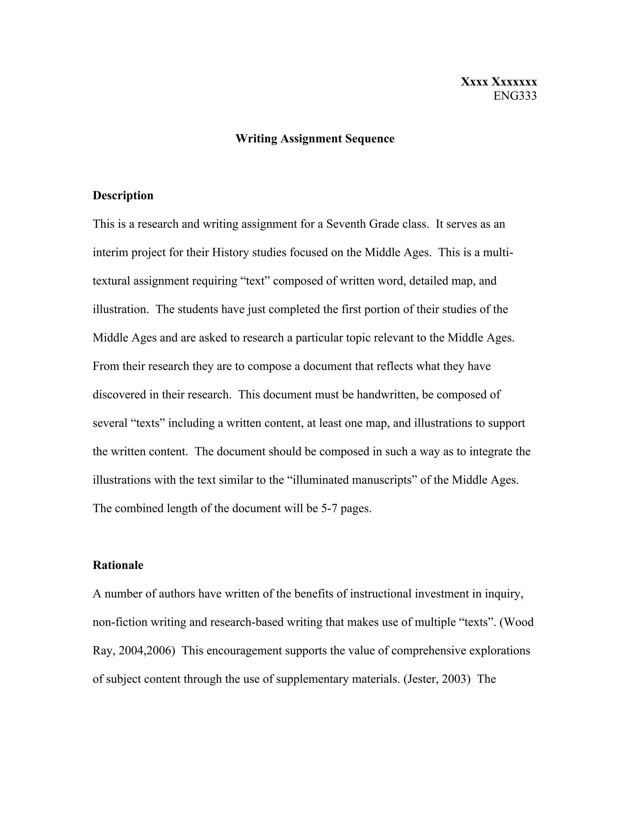 This document provides a description and rationale for a multi-part writing assignment for a 7th grade history class on the Middle Ages. The assignment requires students to research a topic and compose a 5-7 page document integrating written content with at least one map and illustrations. It is designed to develop students' research, writing, and textual analysis skills while extending their knowledge of the Middle Ages. The document outlines the objectives, materials, prerequisites, timeline, procedures, inputs, and assessments for guiding students through the project.