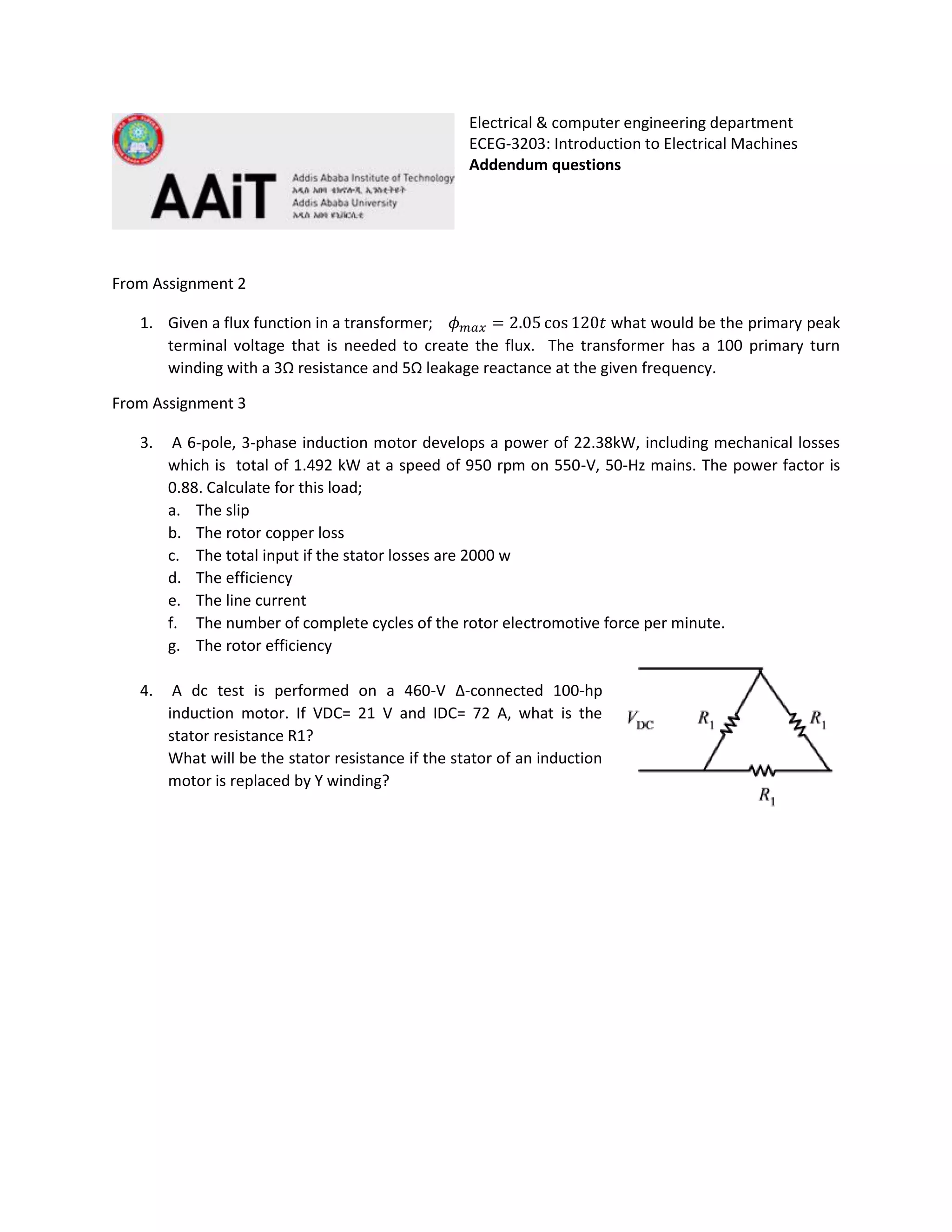 This document contains 12 questions related to electrical machines including transformers, induction motors, synchronous machines, and DC machines. The questions cover topics like determining equivalent circuits, calculating voltages, currents, power, efficiency, slip, and more for various electrical machines and operating conditions. Multiple questions involve calculating values for motors and generators given circuit parameters and operating conditions.