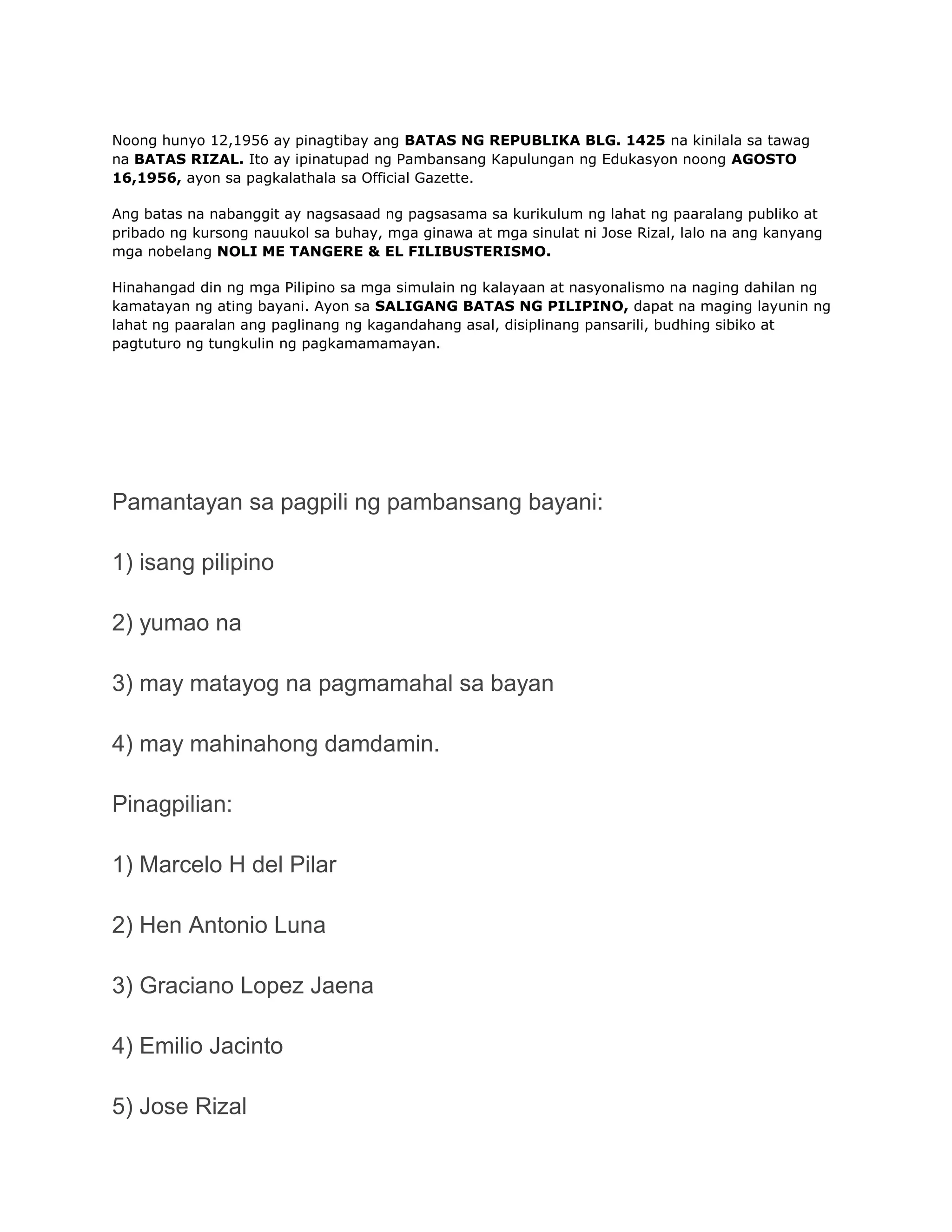 Noong Hunyo 12, 1956, pinagtibay ang Batas Republika Blg. 1425 o Batas Rizal na nag-aatas sa mga paaralan na isama sa kanilang kurikulum ang mga aral mula sa buhay at mga sinulat ni Jose Rizal. Si Rizal ay pinili bilang pambansang bayani dahil sa kanyang matayog na pagmamahal sa bayan, huwaran ng kapayapaan, at ang kanyang mga aral na may kaugnayan sa kasalukuyan. Ang batas ay naglalayong maitalaga ang mga mithiin ng nasyonalismo at kalayaan sa isip ng mga mag-aaral.