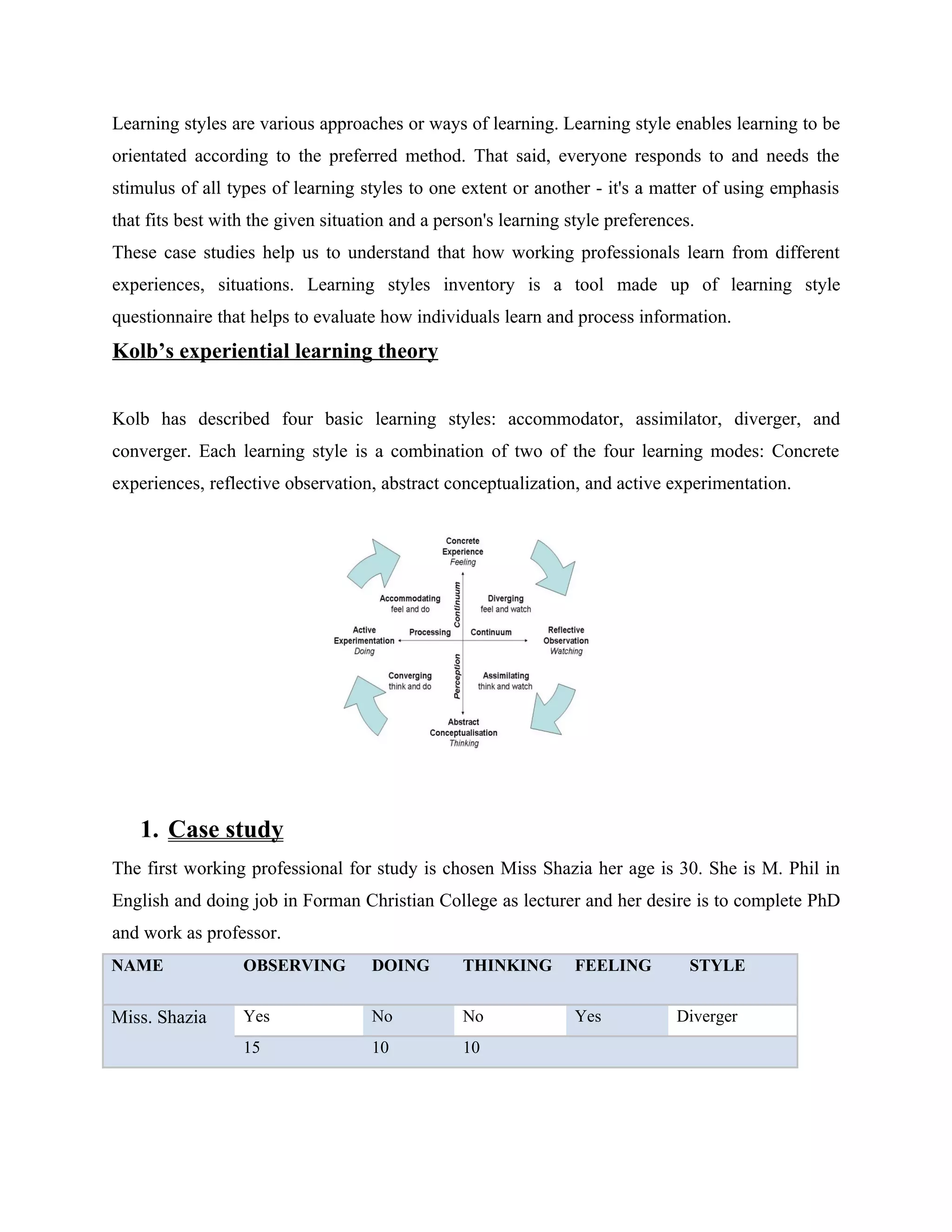 The document discusses four case studies of different working professionals and analyzes their learning styles using Kolb's experiential learning theory.