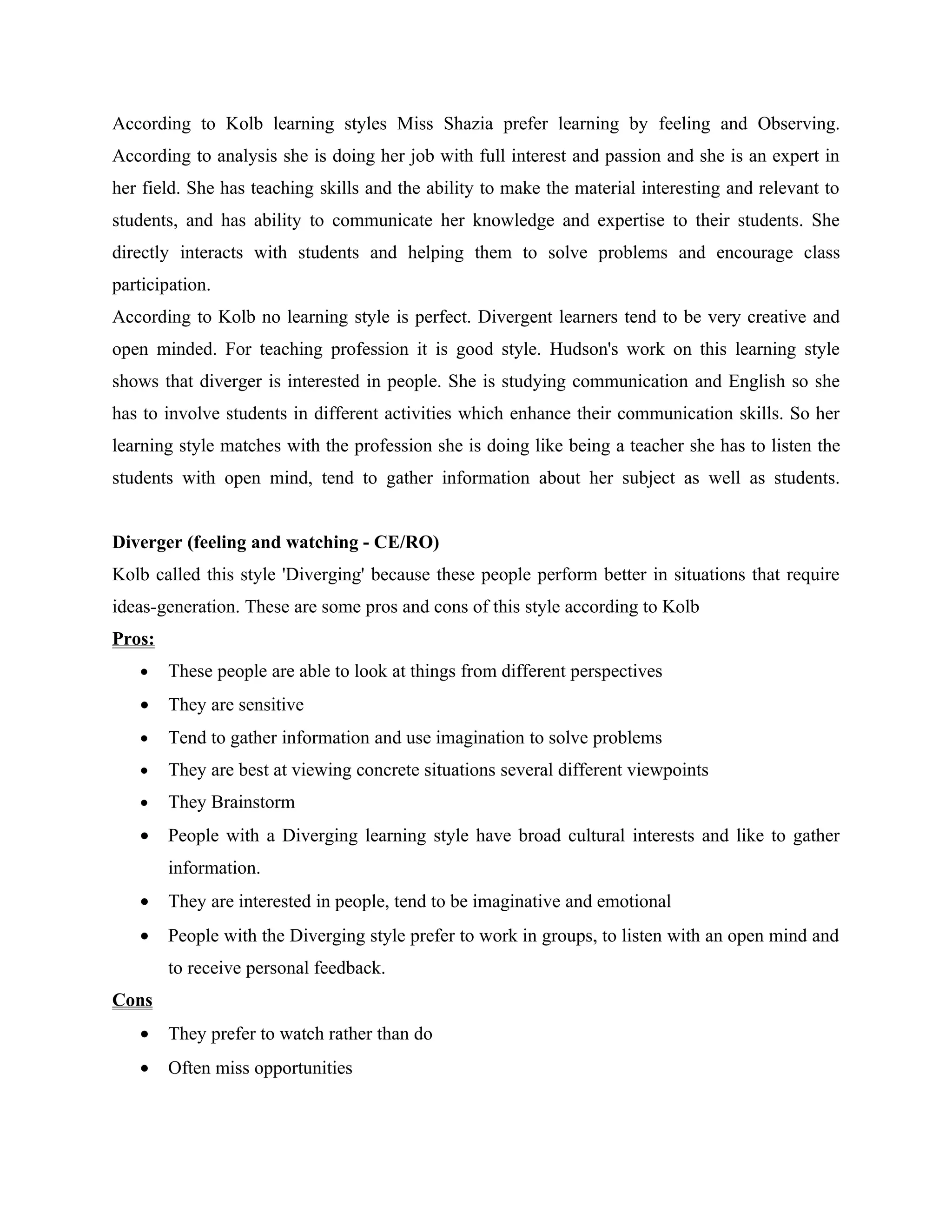 The case studies examine the professionals' job roles and responsibilities, assess their preferred learning styles using Kolb's categories of diverging, assimilating, converging and accommodating. Each case then provides recommendations on how the individuals could improve their learning based on their analyzed style.