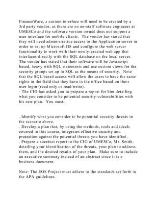 The EOS project requires students to write a research paper of up to 3000 words on potential security vulnerabilities at Umesco, a financial consulting company, in light of their plans to allow mobile access to an outdated ERP system. Students must identify security threats and develop an effective protection plan, utilizing credible sources and APA guidelines. The paper should be formatted in MS Word and include an executive summary for the CIO, highlighting the threats identified and the proposed security measures.