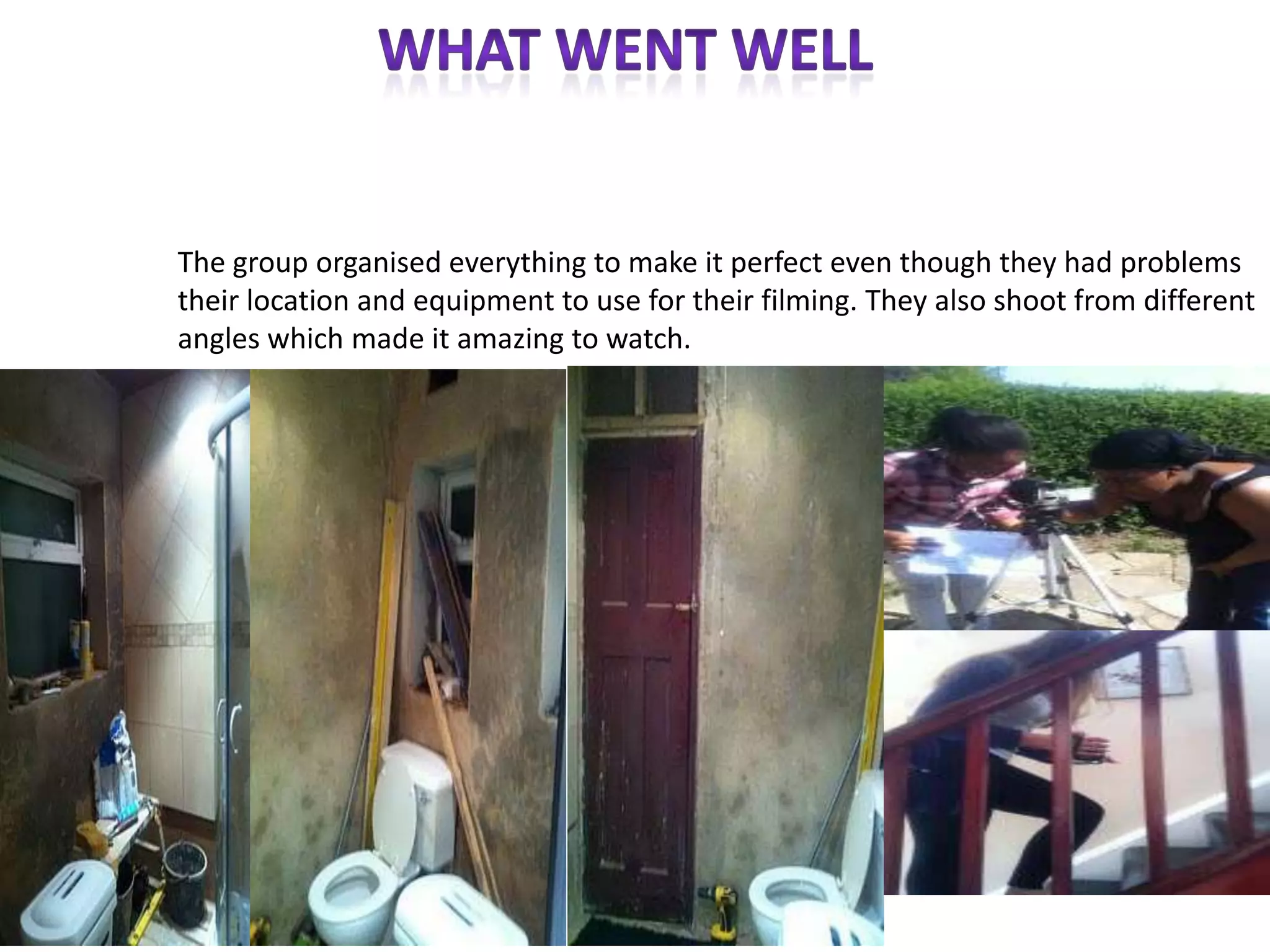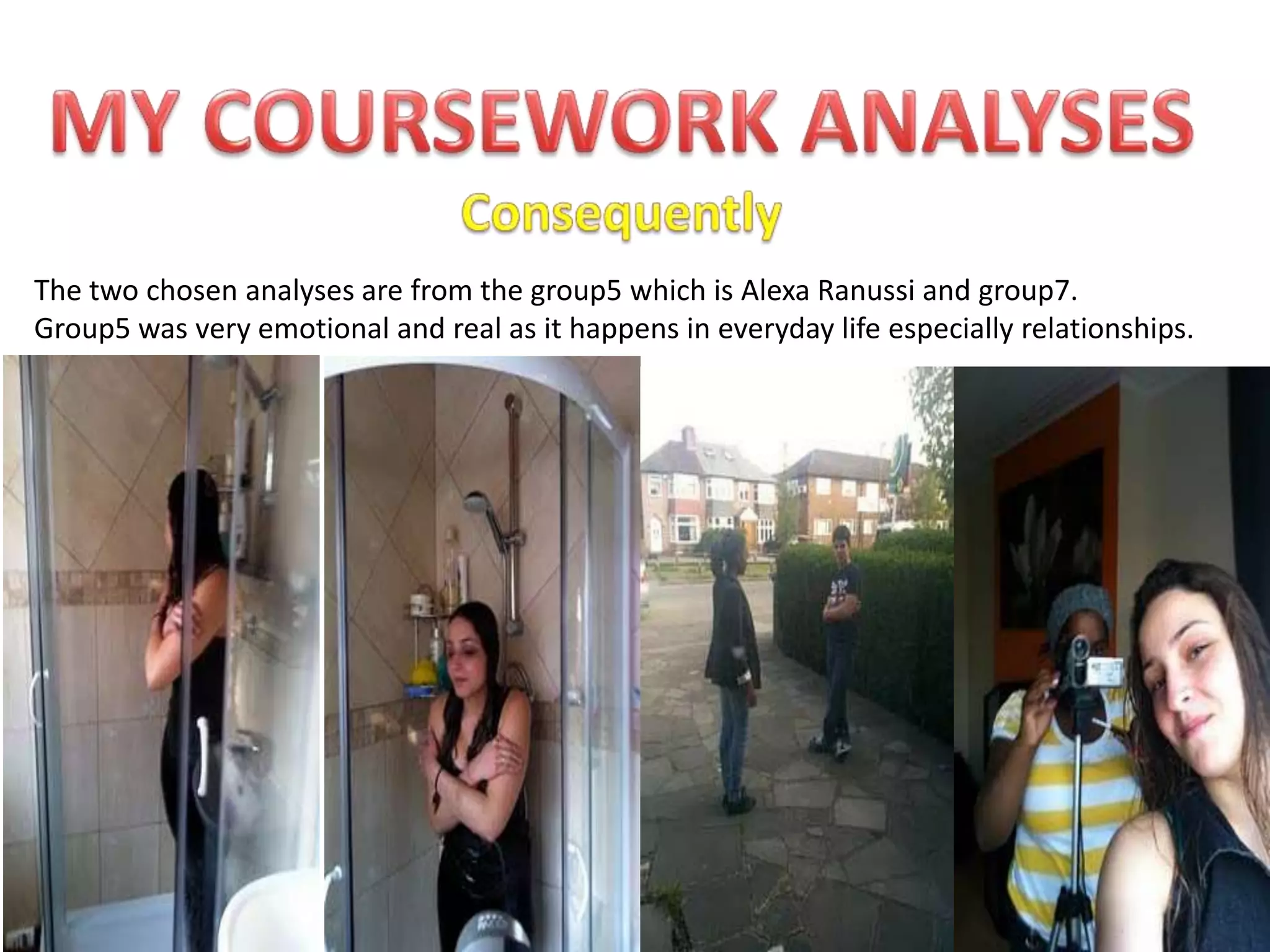 Group5's analysis was emotional and realistic, depicting everyday relationships even as they had problems with their location and equipment. They shot from different angles, making their film amazing to watch. Group7's film was confusing as the guy ignored the girl but she kept returning, acting strangely, creating suspense as the audience wondered what would happen next. More images and characters could have made their film more interesting.