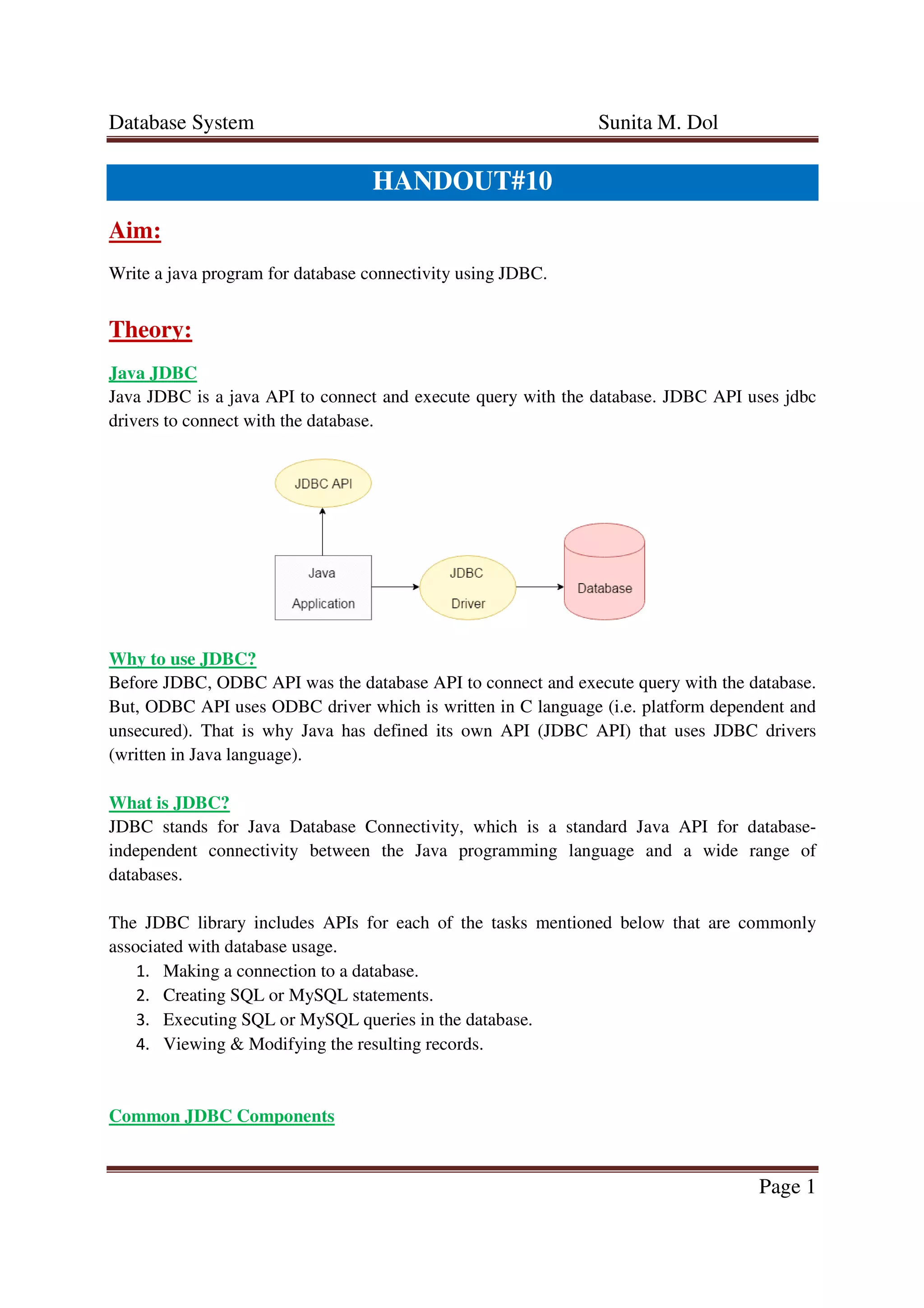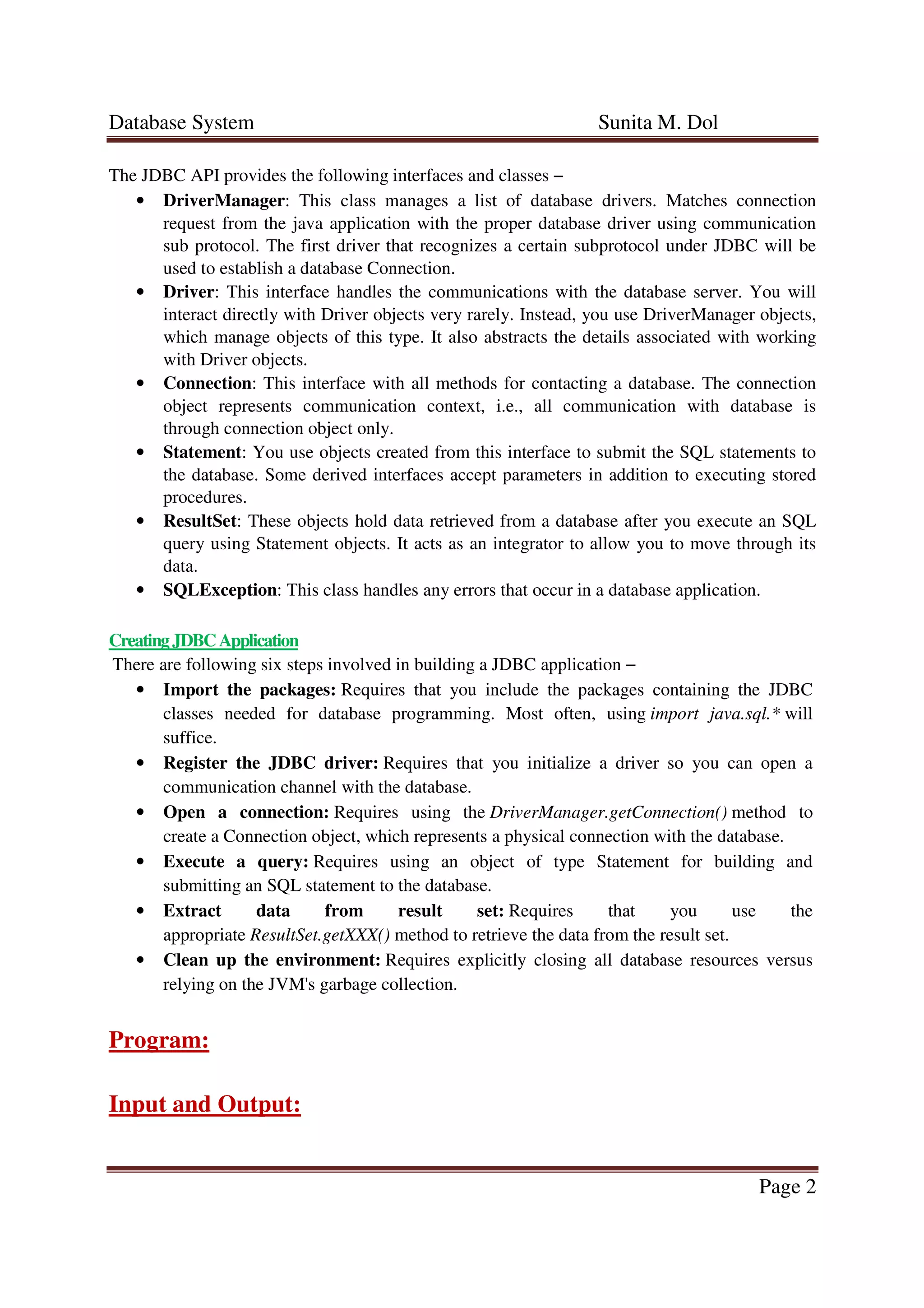 This document discusses Java Database Connectivity (JDBC) and how to connect to a database using JDBC. It explains that JDBC provides interfaces and classes to connect to a database, execute SQL statements, retrieve result sets, and handle exceptions. It also outlines the six steps to create a JDBC application: import packages, register the driver, open a connection, execute queries, extract data from result sets, and clean up resources. The goal is to write a Java program that demonstrates basic database operations like insert, search, delete, and modify using JDBC.