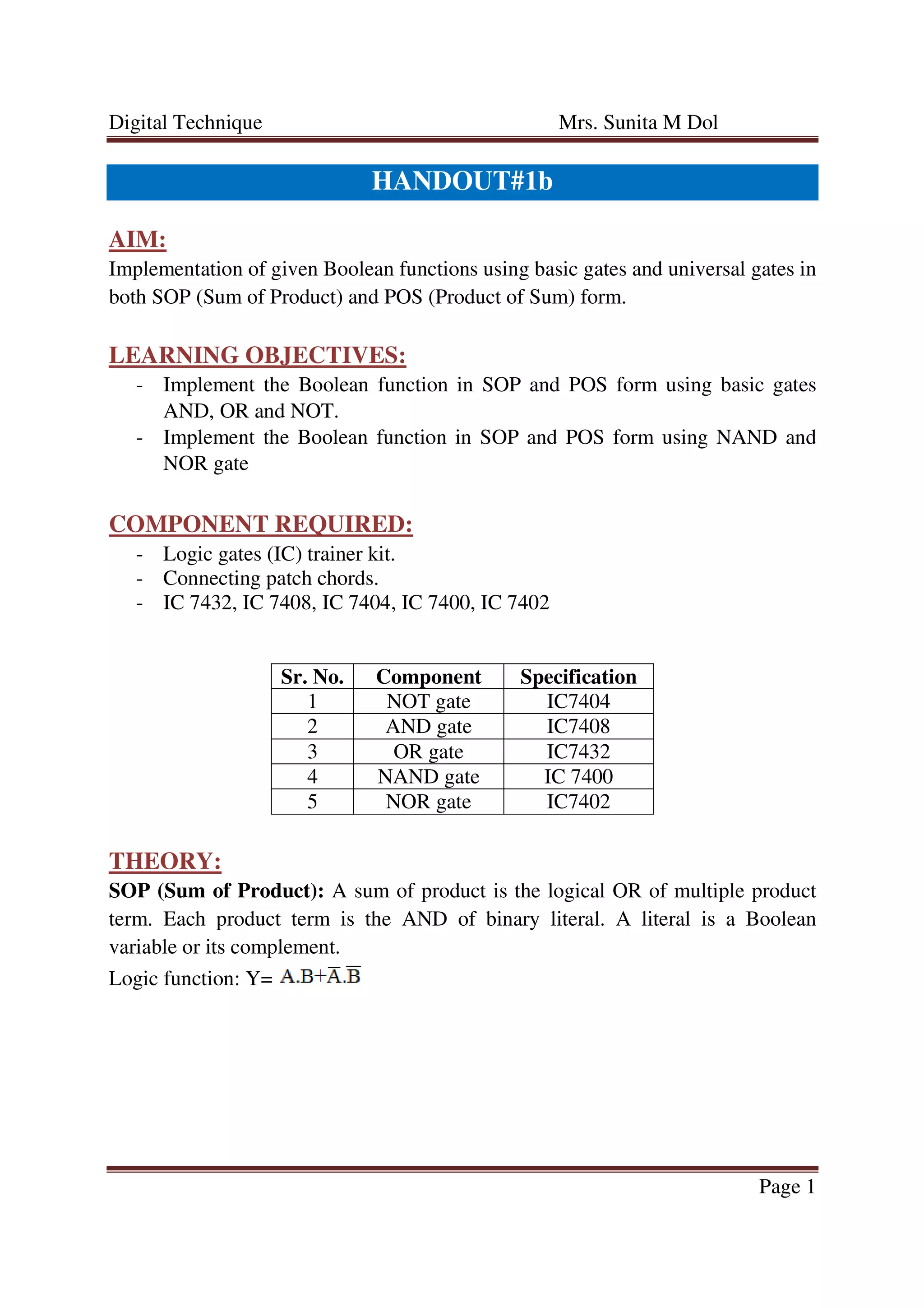 The document outlines a practical approach for implementing Boolean functions using basic AND, OR, NOT, NAND, and NOR gates in both Sum of Products (SOP) and Product of Sums (POS) forms. It includes learning objectives, required components, and a step-by-step procedure for circuit assembly and testing. The result demonstrates the implementation of the specified Boolean expressions using the mentioned logic gates.