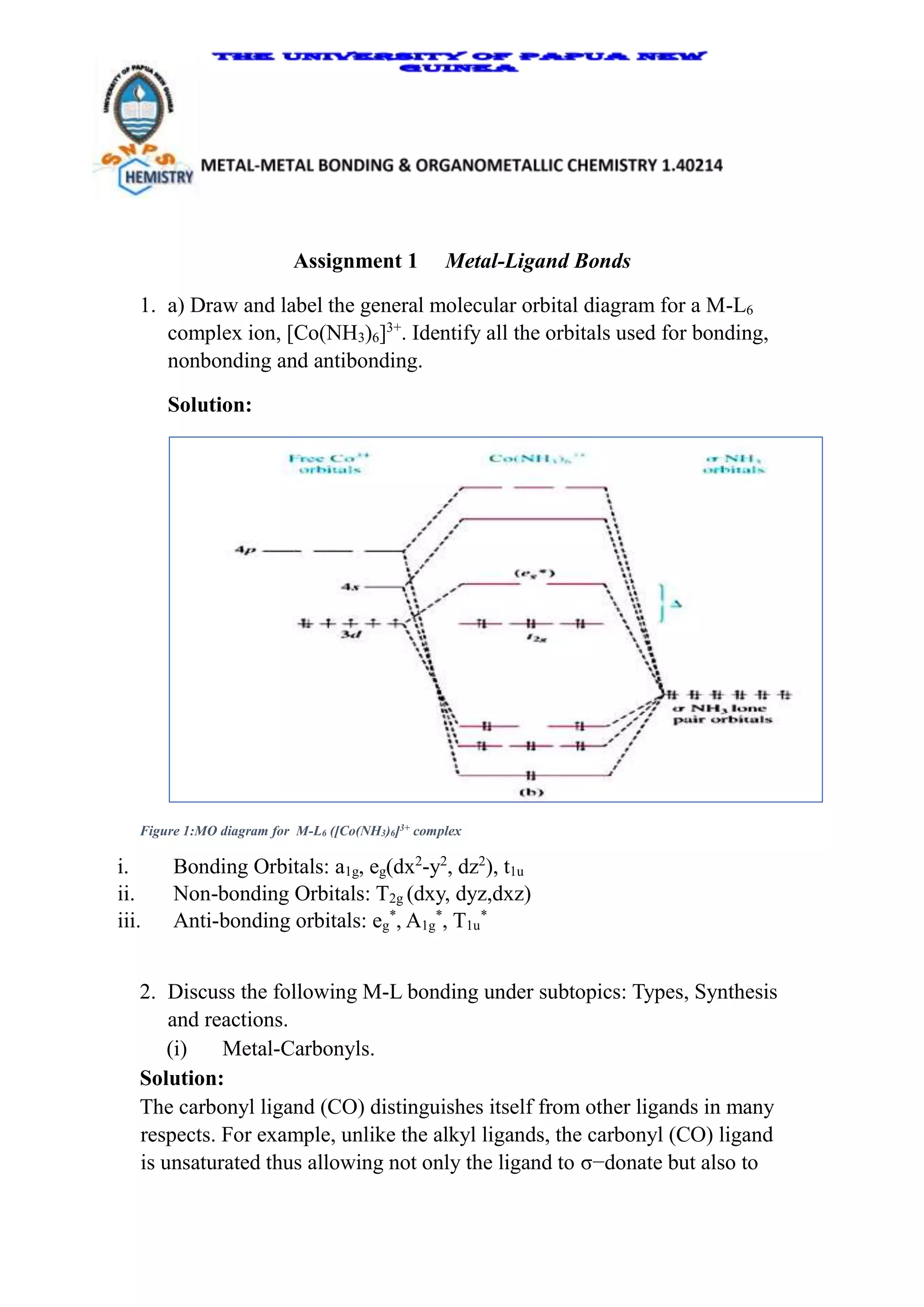 1) Drawing and labeling the molecular orbital diagram for a M-L6 complex, specifically [Co(NH3)6]3+.