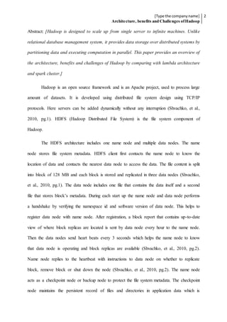 Hadoop is an open source framework for distributed storage and processing of large datasets across clusters of computers. It uses HDFS for data storage, which partitions data into blocks and replicates them across nodes for fault tolerance. The master node tracks where data blocks are stored and worker nodes execute tasks like mapping and reducing data. Hadoop provides scalability and fault tolerance but is slower for iterative jobs compared to Spark, which keeps data in memory. The Lambda architecture also informs Hadoop's ability to handle batch and speed layers separately for scalability.