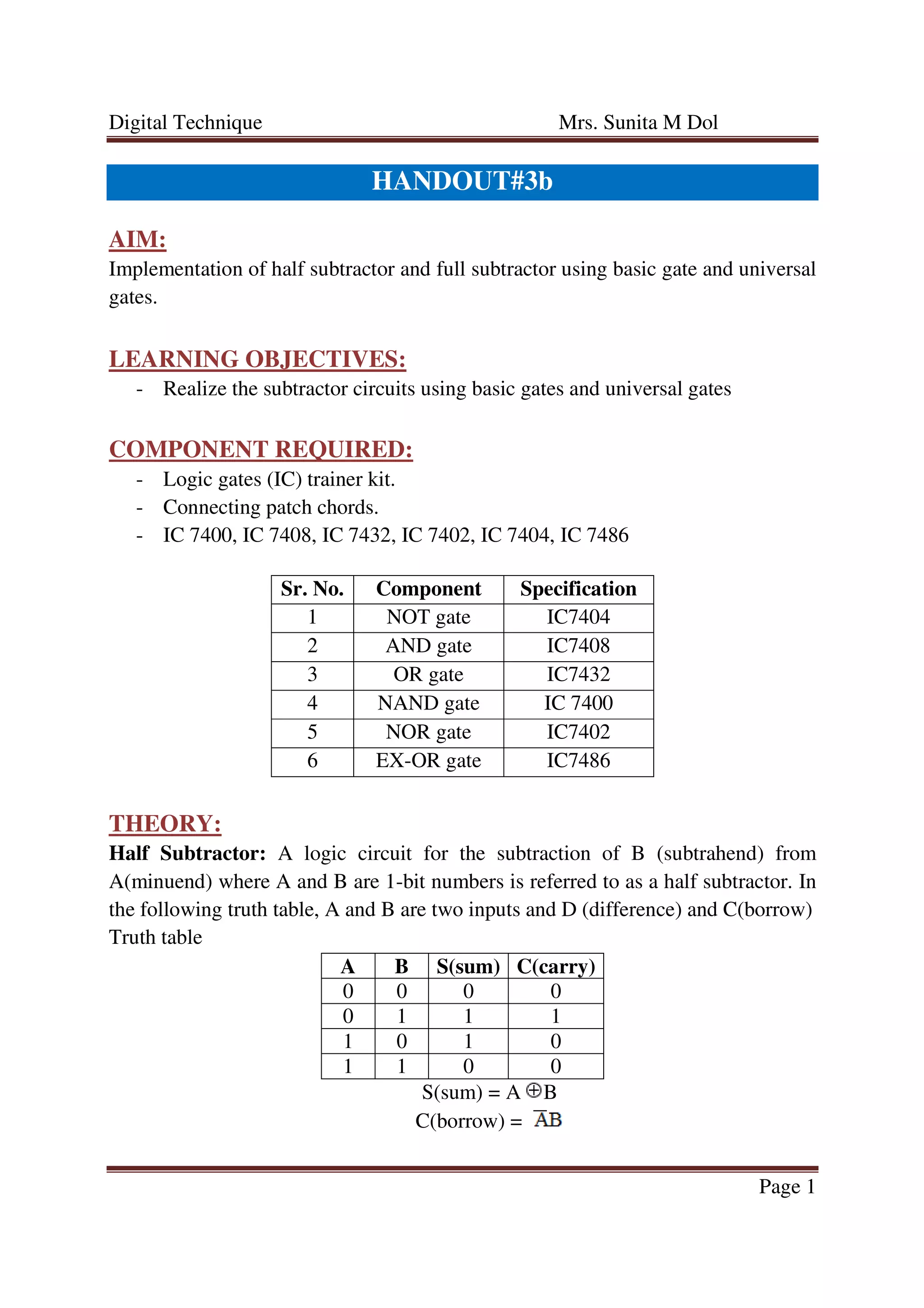 This document discusses the implementation of half subtractors and full subtractors using basic logic gates and universal gates. It begins by defining a half subtractor and full subtractor, providing their truth tables. It then shows how to design half and full subtractors using NAND, NOR, and other gates. Circuit diagrams are provided for subtractors built with basic gates as well as those using only NAND or only NOR gates. The purpose is for students to realize subtractor circuits using different gate implementations and understand their logic and components.