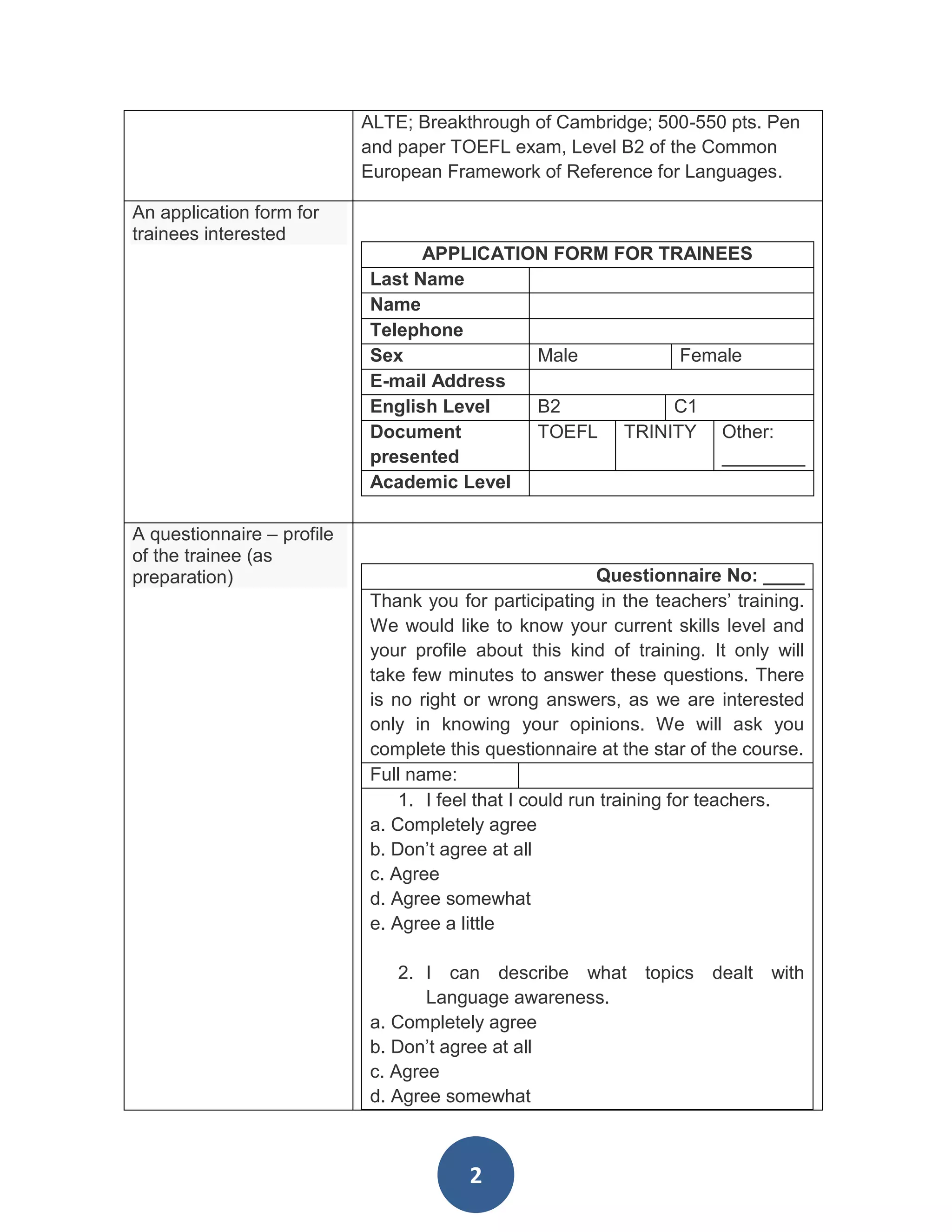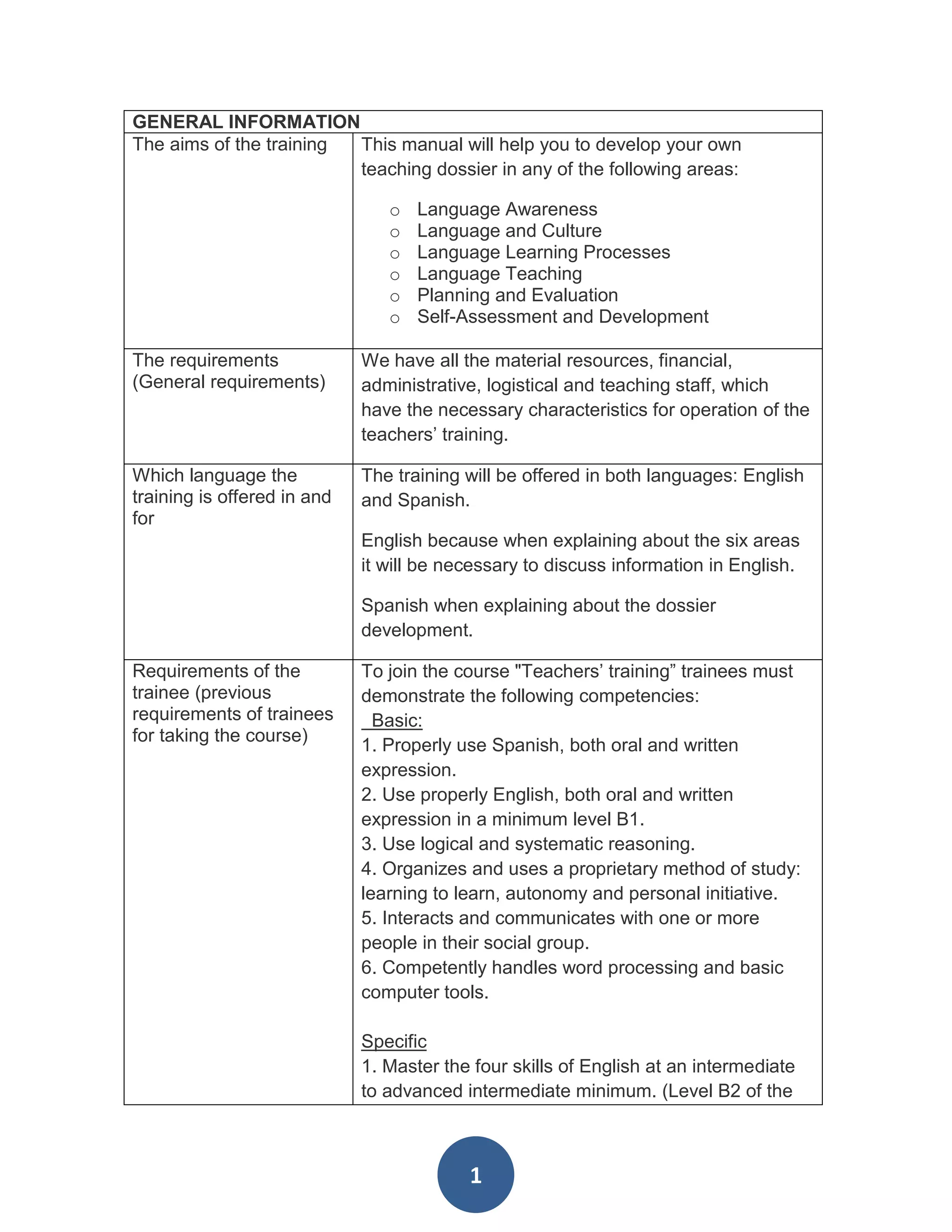 The training aims to develop teaching dossiers in areas like language awareness, language and culture, language learning processes, language teaching, planning and evaluation, and self-assessment. It will be offered in English and Spanish. Trainees must demonstrate basic competencies like language proficiency and computer skills. The training consists of 6 modules covering the key content areas. It will be delivered through 120 hours of face-to-face lessons, assignments, and evaluations. Trainees must maintain 80% attendance and score at least 80% overall to complete the certification which assesses knowledge, skills, and participation.