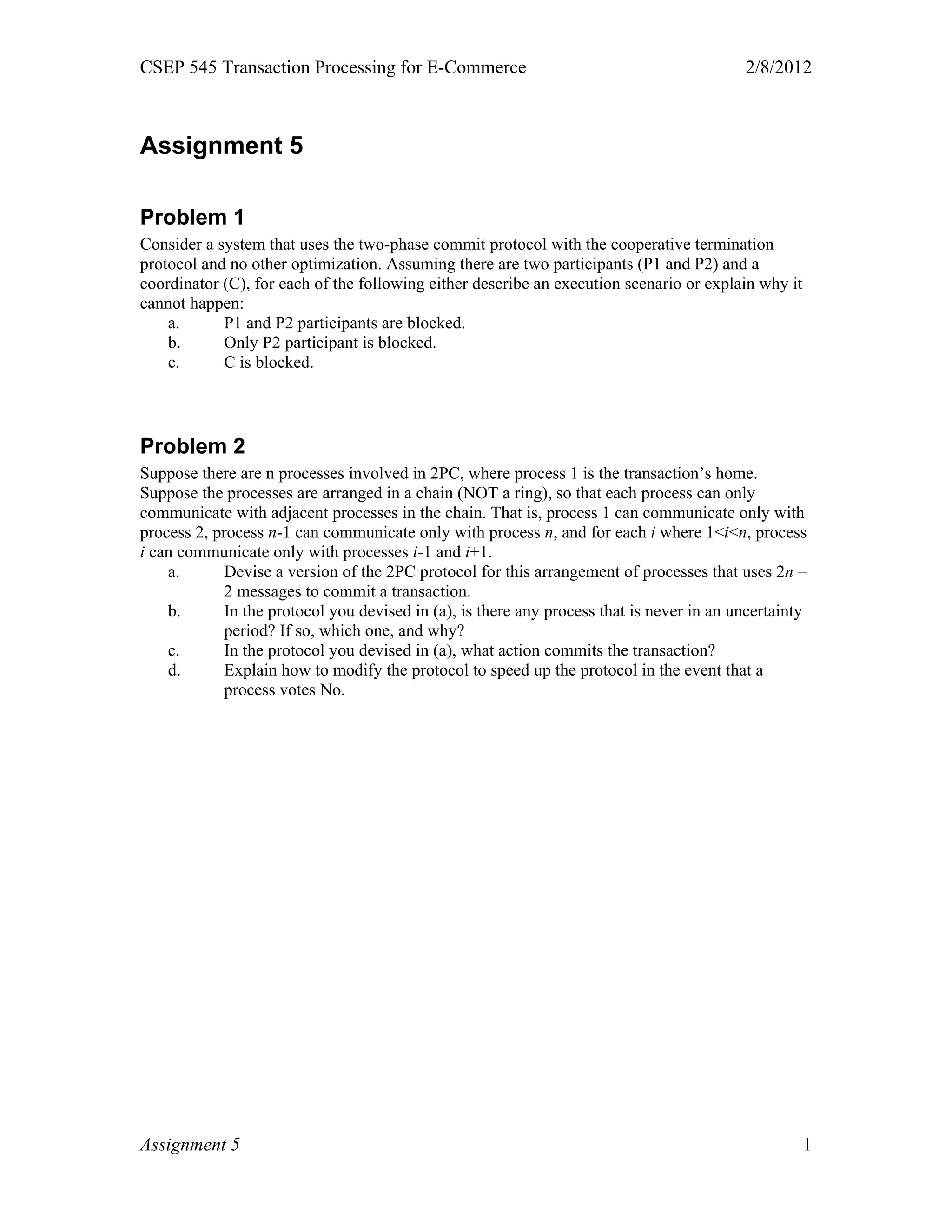 This document discusses two problems related to the two-phase commit protocol. Problem 1 asks about possible execution scenarios when there are two participants and a coordinator using the two-phase commit protocol with cooperative termination. Problem 2 asks about devising a version of the two-phase commit protocol for a chain of n processes where each process can only communicate with adjacent processes, and asks questions about the protocol.