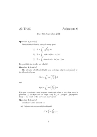 This document contains instructions for 5 assignment questions involving numerical integration and solving differential equations. Question 1 involves using the quad function to evaluate several integrals. Question 2 involves using quad to evaluate Fresnel integrals and plot the results. Question 3 involves using Monte Carlo methods to estimate volumes and double integrals. Question 4 involves using Euler's method to solve an initial value problem and analyze errors. Question 5 involves using lsode to solve a system of differential equations modeling atmospheric circulation and experimenting with initial conditions.