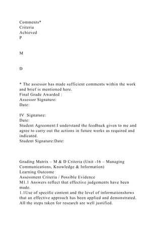 The document outlines a detailed assignment for a course in business management, including unit titles, learning outcomes, grading criteria, and assessment tasks focused on managing communications, knowledge, and information. It emphasizes the importance of effective communication, personal networking, and appropriate information systems within organizations to enhance decision-making and operational efficiency. Additionally, it includes a grading matrix and requires students to submit their work along with confirmation of academic honesty.