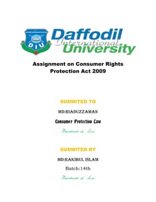 The document discusses the Consumer Rights Protection Act of Bangladesh. It provides definitions of key terms like "consumer" and describes the structure of the Act. The Act aims to protect consumers from unfair trade practices by defining prohibited "acts against consumer rights." It establishes organizations like the Consumer Rights Protection Department and Council to enforce consumer protections. However, consumers in Bangladesh still lack awareness of their rights and face issues like illiteracy and economic hardship that allow cheating by producers. Proper enforcement of consumer protection laws is needed to ensure quality products, services, and benefit the overall economy.
