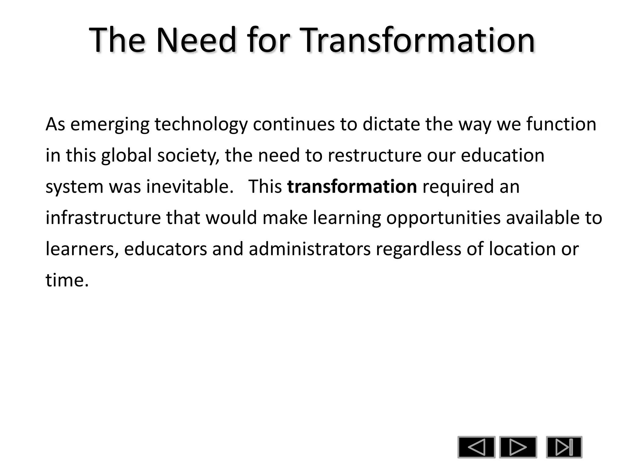 The document discusses the need to transform education through technology. It explains how the Federal Communications Commission established the E-Rate program to provide funding to support connectivity in schools and libraries. The E-Rate provides discounts of 20-90% on telecommunication services to ensure affordable access to modern technology. Schools must develop technology plans and apply annually for discounts. The plan should show how technology will be used to achieve curriculum goals and guide technology investments. Irving ISD's technology plan expands over three years and has seven goals focused on technology integration, professional development, infrastructure, and administration.