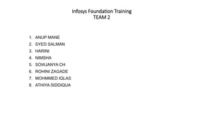 This document summarizes an Infosys Foundation training for Team 2 which includes 8 members. It provides a series of practice questions on topics like coding and decoding, symbol patterns, alphabet series, alphabet counting and classification. The questions are multiple choice and the answers are provided at the end.