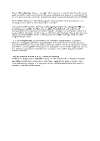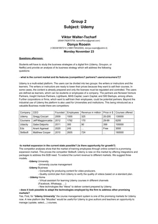 The document outlines a group assignment focused on the analysis of Udemy and its competitive positioning in the digital education market, compared to other firms like Groupon and Netflix. It highlights Udemy's diverse market strategies, potential for growth in B2B partnerships, and its current patent portfolio, which is limited compared to competitors. The analysis suggests that Udemy presents the best investment opportunity among the evaluated companies, especially post-pandemic, due to its substantial user base and funding activities.