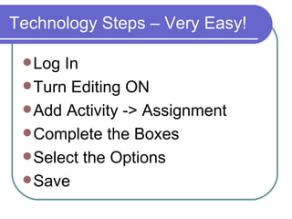 This document provides steps and tips for designing effective assignments in Moodle. It outlines the basic technology steps to add an assignment activity, and emphasizes designing assignments that save time and frustration while motivating students to learn. It asks instructors to consider why they want the assignment, what they want students to learn, how they want the assignment completed, how it will be graded, and when it is due. Details like formatting examples and opportunities for discussion are recommended to help students understand what is expected.