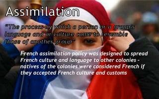 French assimilation policy aimed to spread French culture and define citizens as either French or foreign. This led to divisions in society and a sense of displacement for youth. As assimilation failed to integrate migrants, it distorted cultures and elevated far-right politics. Youth felt rejected by French society and created their own identities by adopting surrogate cultures from the UK and US. Assimilation policies have deeply divided French society along ethnic and religious lines.
