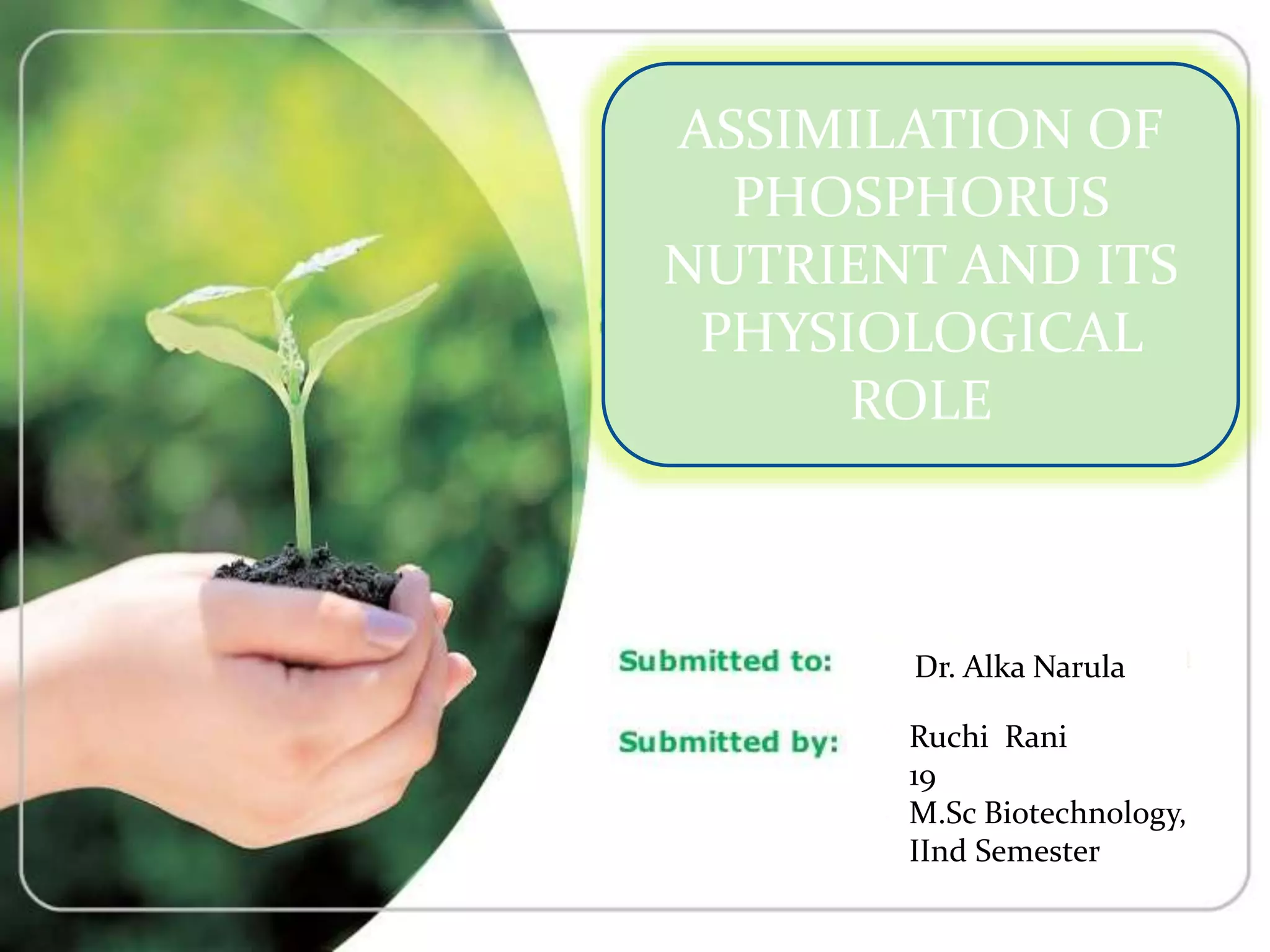 Phosphorus is an essential plant macronutrient that is required for many critical cellular functions and processes. It is a component of key molecules like nucleic acids, phospholipids, and ATP. Phosphorus exists in both organic and inorganic forms in soil, but most soil phosphorus is unavailable to plants. Plants have developed strategies to acquire phosphorus from soil like forming specialized root structures and exuding organic acids. Phosphate is transported across plant membranes through cotransporters and is compartmentalized within cells. Plants tightly regulate phosphorus uptake, transport, and recycling in response to phosphorus availability through physiological and morphological adaptations.