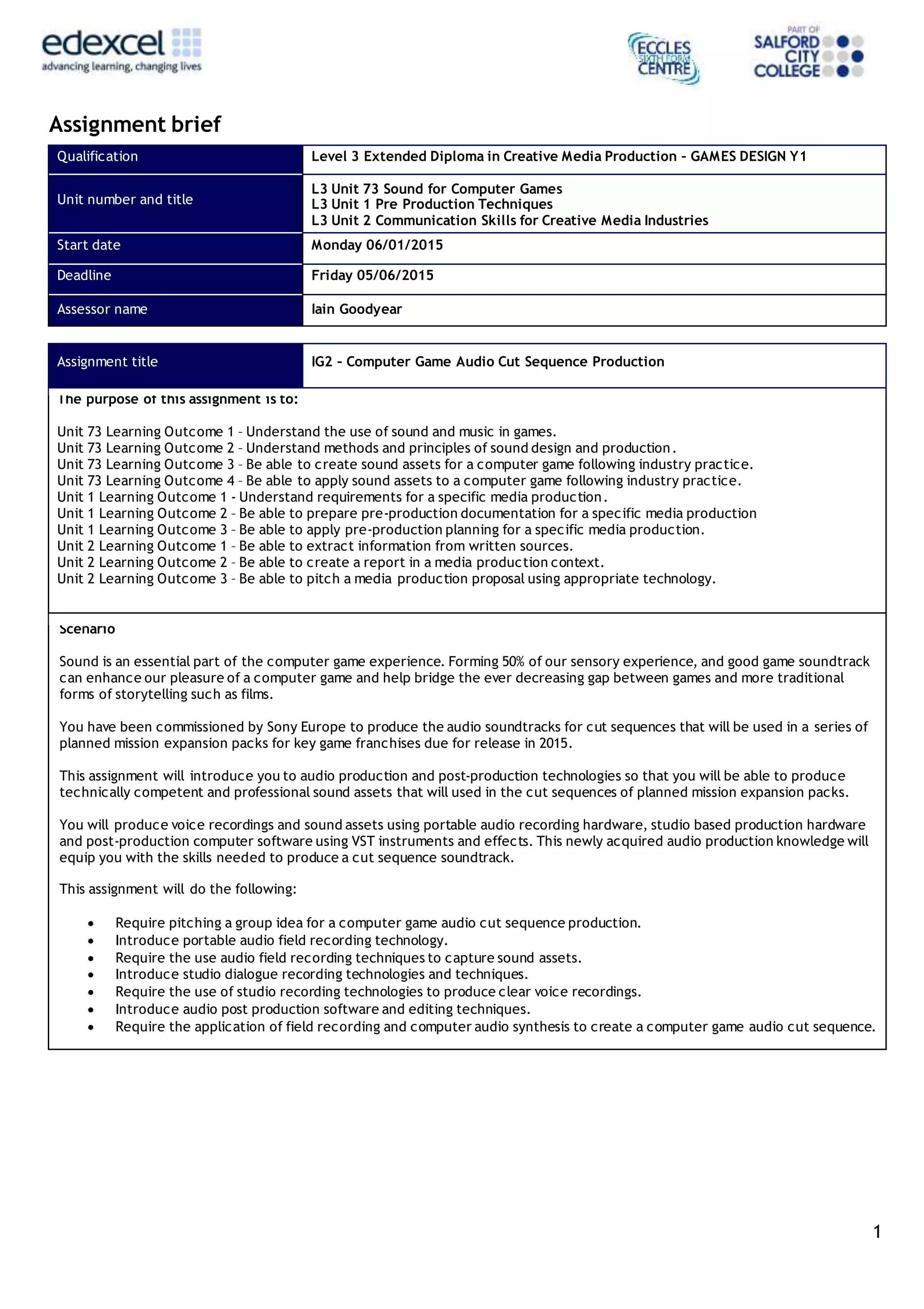 This document provides an assignment brief for a qualification in creative media production. The assignment involves producing audio assets for computer game cut sequences, including recording dialogue and sound effects, and editing them together. It consists of 11 tasks, such as researching sound design terms, analyzing existing game audio, scriptwriting, recording dialogue in a studio, editing sounds using software, and programming the finished audio into a game. The tasks assess learning outcomes related to understanding sound design, pre-production documentation, communication skills, and applying audio production skills to industry standards. The deadline for completion is June 5th, 2015.