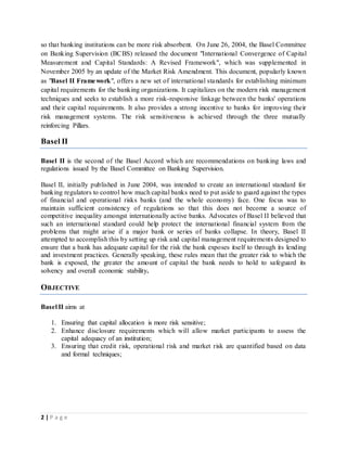Basel II and III are international banking regulatory accords that establish capital requirements and risk management standards. Basel II, established in 1988, focused on credit risk but did not adequately address operational and market risk. Basel III, developed after the 2008 crisis, strengthened capital and liquidity requirements and introduced leverage and liquidity ratios. The Basel accords aim to ensure banks maintain adequate capital reserves to absorb losses and promote stable, risk-sensitive banking globally.