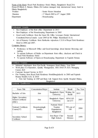 This resume summarizes Md. Nazir Hossain's work experience. He has over 15 years of experience in hospitality working in various roles, including his current role as Assistant Head Concierge at Royal Park Residence Hotel in Dhaka, Bangladesh. Prior to that, he held positions as Airport Representative, Waiter, Housekeeping Attendant, and Senior Room Attendant at different hotels in Bangladesh and the United Arab Emirates. He has a Bachelor of Arts degree and has completed several certificate courses related to hospitality. He is proficient in English, Bengali, and Microsoft Office applications.