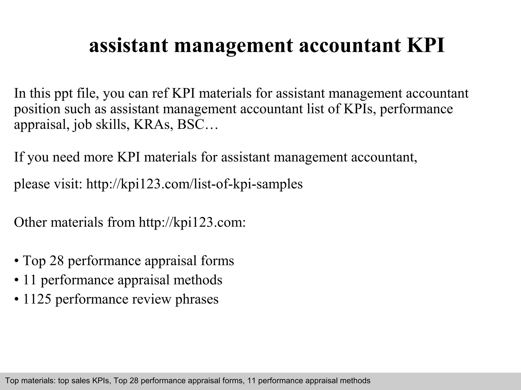 This document discusses key performance indicators (KPIs) for assistant management accountants. It provides steps to create KPIs for this position, including defining objectives, identifying key result areas and tasks, and determining how to measure results. The document also lists common mistakes in developing KPIs, such as creating too many, and discusses how KPIs should be linked to strategy and empower employees. Various types of KPIs are defined, and the document recommends additional KPI resources available on an online portal.