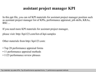 This document discusses key performance indicators (KPIs) for an assistant project manager position. It provides examples of KPIs, steps for creating KPIs, common mistakes to avoid, and how to design effective KPIs. The document recommends visiting an online site for more KPI samples and additional materials on performance appraisals, review phrases, and interview questions.