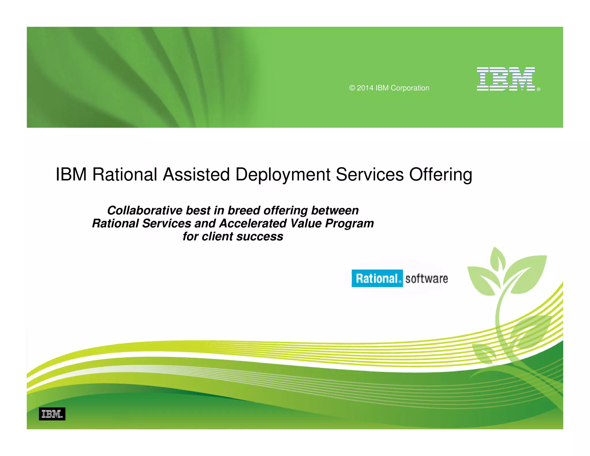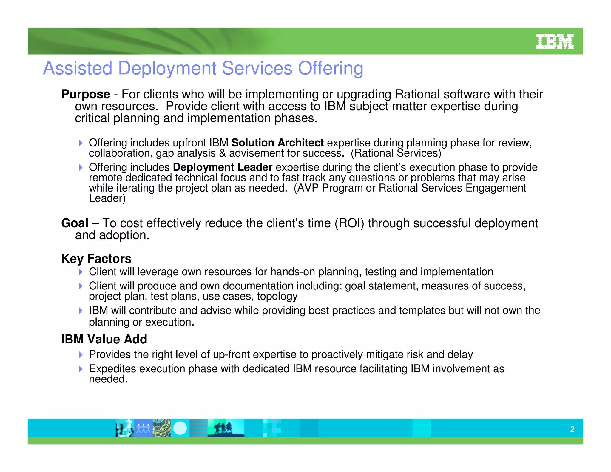 This document describes IBM's Rational Assisted Deployment Services offering which provides IBM subject matter expertise during critical planning and implementation phases of a client's Rational software deployment or upgrade project using the client's own resources. The offering includes an IBM solution architect for planning and a deployment leader during execution. The goal is to reduce the client's time and costs through a successful deployment. Key factors include the client leveraging their own resources while IBM contributes best practices and advice. IBM's value add is in mitigating risks and expediting the project with dedicated resources.