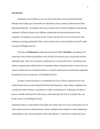 This document discusses the debate around active and passive euthanasia from philosophical and ethical perspectives. It outlines the arguments of James Rachels, who believes there is no moral difference between active and passive euthanasia, versus the American Medical Association (AMA) view that active euthanasia is unethical. The document also discusses Philippa Foot's perspective that passive euthanasia may be acceptable in extreme cases, but active euthanasia requires more consideration of specific conditions. The debate centers around doctors' role in relieving patient suffering versus directly causing a patient's death.