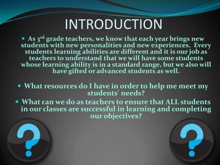 This document provides an overview of assistive technology and resources for teachers to support students with different abilities. It defines universal design for learning and the Individuals with Disabilities Education Act. It then discusses choosing assistive technology and provides examples of technologies and strategies to support students with ADHD, auditory disabilities, and mild disabilities. Resources for further information are also listed.