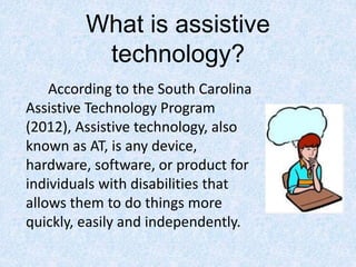 The document discusses assistive technology and its importance for students with disabilities. It defines assistive technology as any device that allows individuals with disabilities to perform tasks more easily and independently. It also outlines the key provisions of the Rehabilitation Act of 1973, which requires schools to provide assistive technology and related services to qualified students. Several examples of assistive technologies are described, including a portable microphone to help hearing impaired students, a video magnifier for visually impaired students, talking calculators for learning disabilities, and a keyboard for physically disabled students.