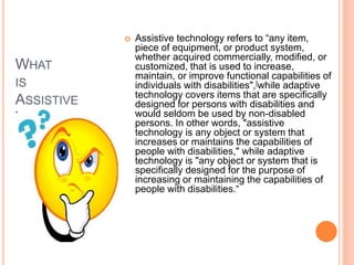 This document discusses assistive technology, which refers to devices or equipment that help individuals with disabilities function better. It defines assistive technology and adaptive technology, and describes how assistive technology is used to support individuals with various disabilities, including hearing, visual, physical, and learning disabilities. The document also outlines several laws related to assistive technology and the rights of individuals with disabilities.
