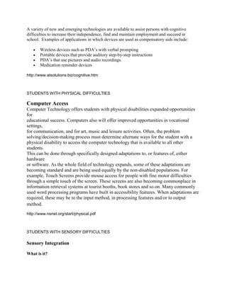 The document discusses assistive technology and defines it as mechanical aids that substitute for or enhance physical or mental abilities impaired by conditions such as disabilities, injuries, or delays. Assistive technology includes simple devices like pencil grips to more advanced options like computers and can help individuals perform tasks of daily living. The Individuals with Disabilities Education Act provides a legal definition and mandates assistive technologies be used in education to accommodate people with disabilities.