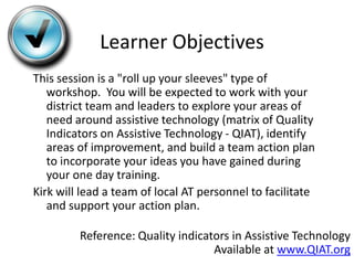 The document outlines a workshop led by Kirk D. Behnke focused on creating a district action plan for assistive technology (AT) implementation. It emphasizes the importance of collaborative planning to improve educational outcomes for students with disabilities, detailing quality indicators and best practices for AT services. Participants are expected to identify needs, build an action plan, and involve various stakeholders in the implementation process.