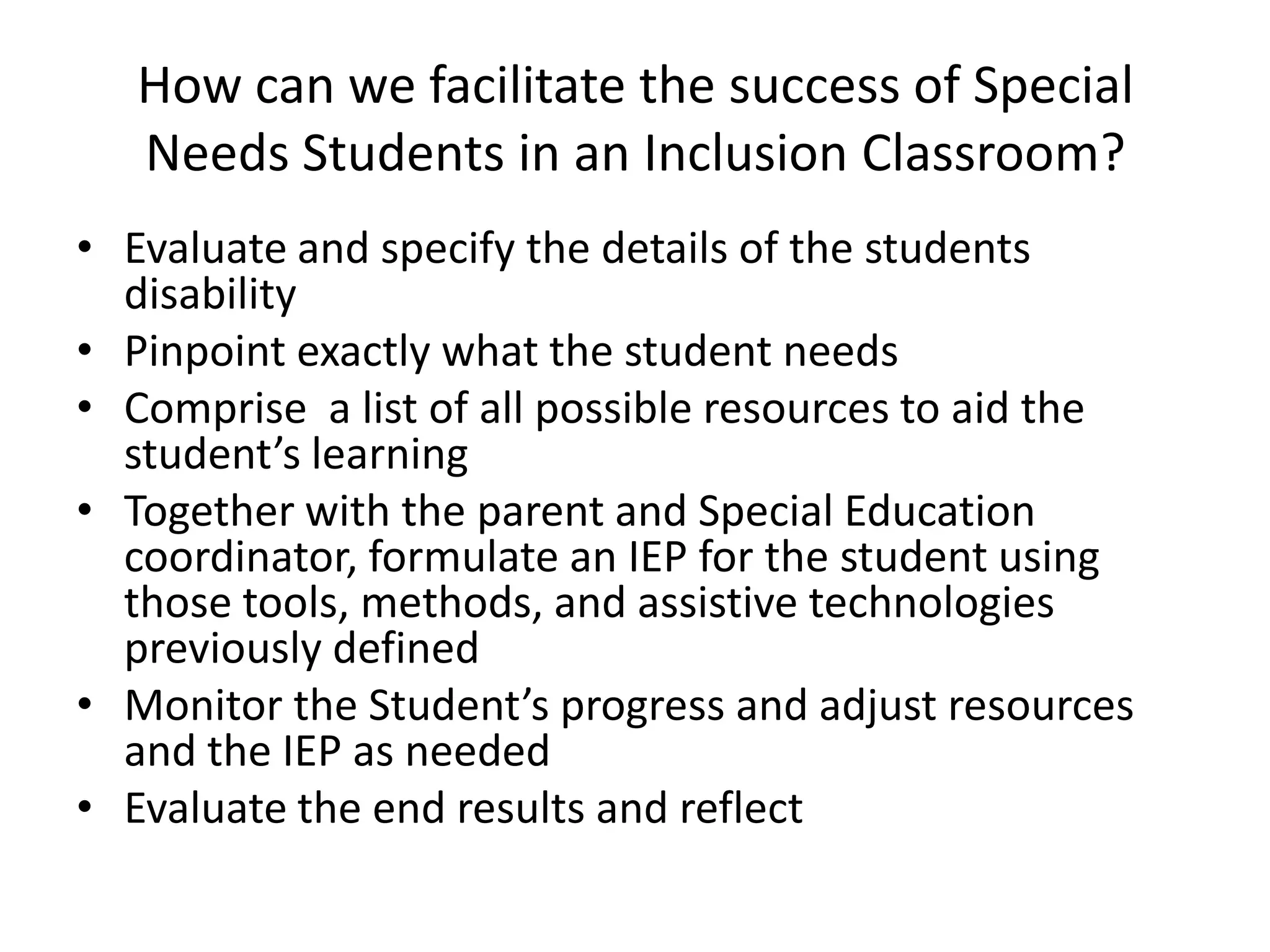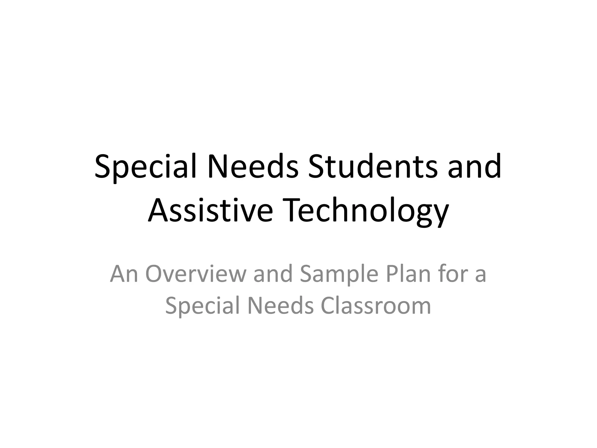 This document provides an overview and sample plan for using assistive technologies in a special needs classroom. It discusses evaluating students' disabilities, developing individualized education plans, and monitoring progress. It then offers specific assistive technology recommendations for different types of students in the sample classroom: websites, software, and devices to help students with ADHD, an auditory disability, and mild learning disabilities impacting reading and writing. The technologies are meant to facilitate success for special needs students in an inclusion classroom.