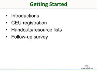 2) It describes the Student, Environment, Tasks, Tools (SETT) model for selecting appropriate AT tools based on the student's needs, environment and tasks.